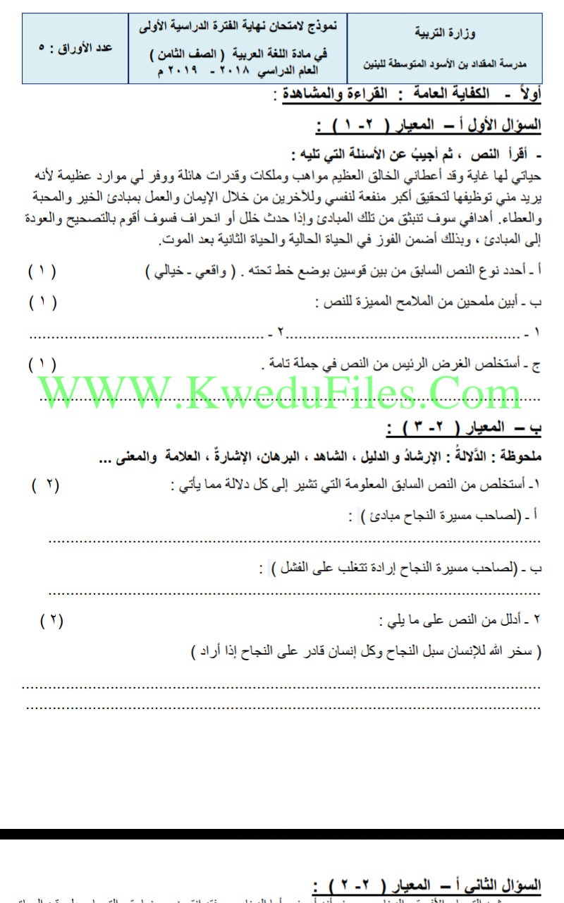 اختبارات تجريبية في مادة اللغة العربية للعام, الصف الثامن, لغة عربية, الفصل الأول, 2018-2019 - المناهج الكويتية