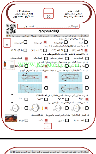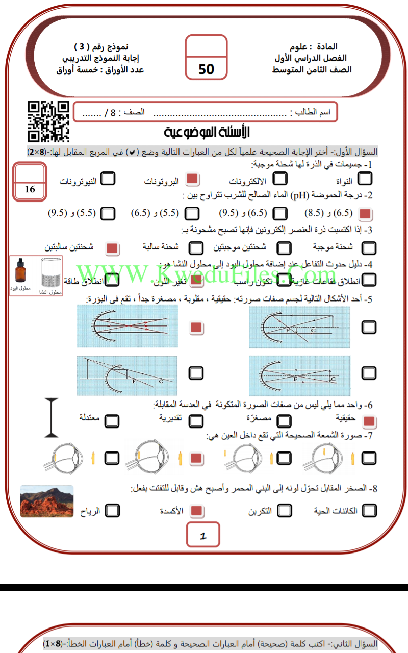 معلومات الملف: 5اوراق في مادة العلوم للصف الثامن للكورس الاول تتضمن نموذج اجابة اختبار تدريبي | ||