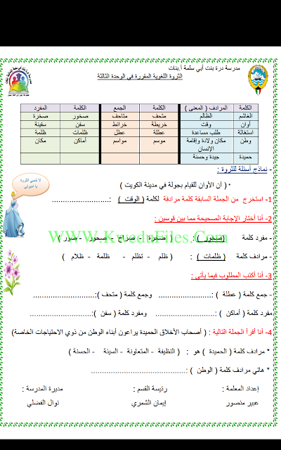 معلومات الملف: ورقة واحدة في مادة اللغة العربية للصف الثالث للكورس الاول تتضمن الثروة اللغوية المقررة للوحدة الثالثة | ||