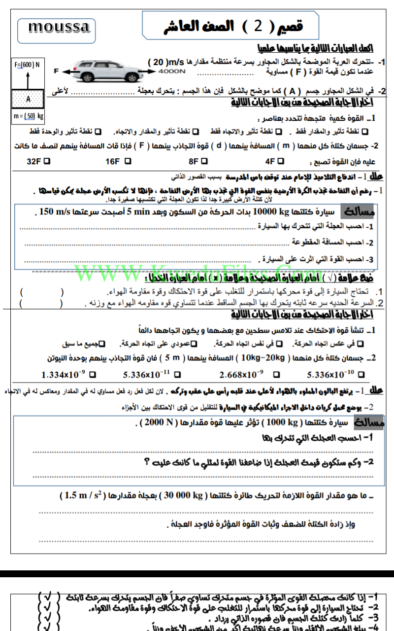 3اوراق في مادة الفيزياء للصف العاشر للكورس الاول تتضمن نموذج اختبار قصير