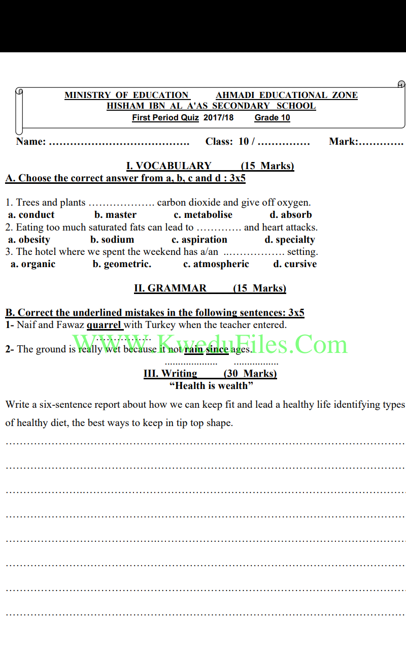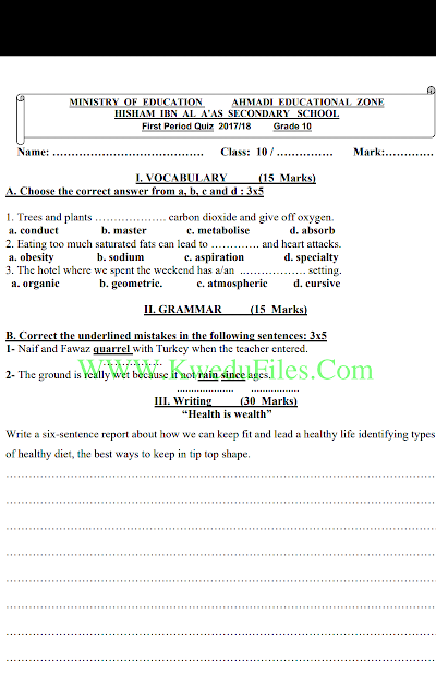 أنت هنا: موقع المناهجالمناهج الكويتية الصف العاشر لغة انجليزية الفصل الأول الامتحان النهائي
