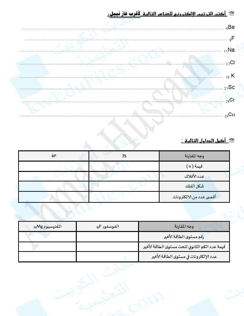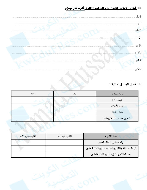 اليكم ورقة تقويمية في مادة الكيمياء للصف العاشر بعنوان الالكترونات في الذرات - الفصل الاول من العام الدراسي 2018-2019  وذلك وفق المنهاج الكويتي