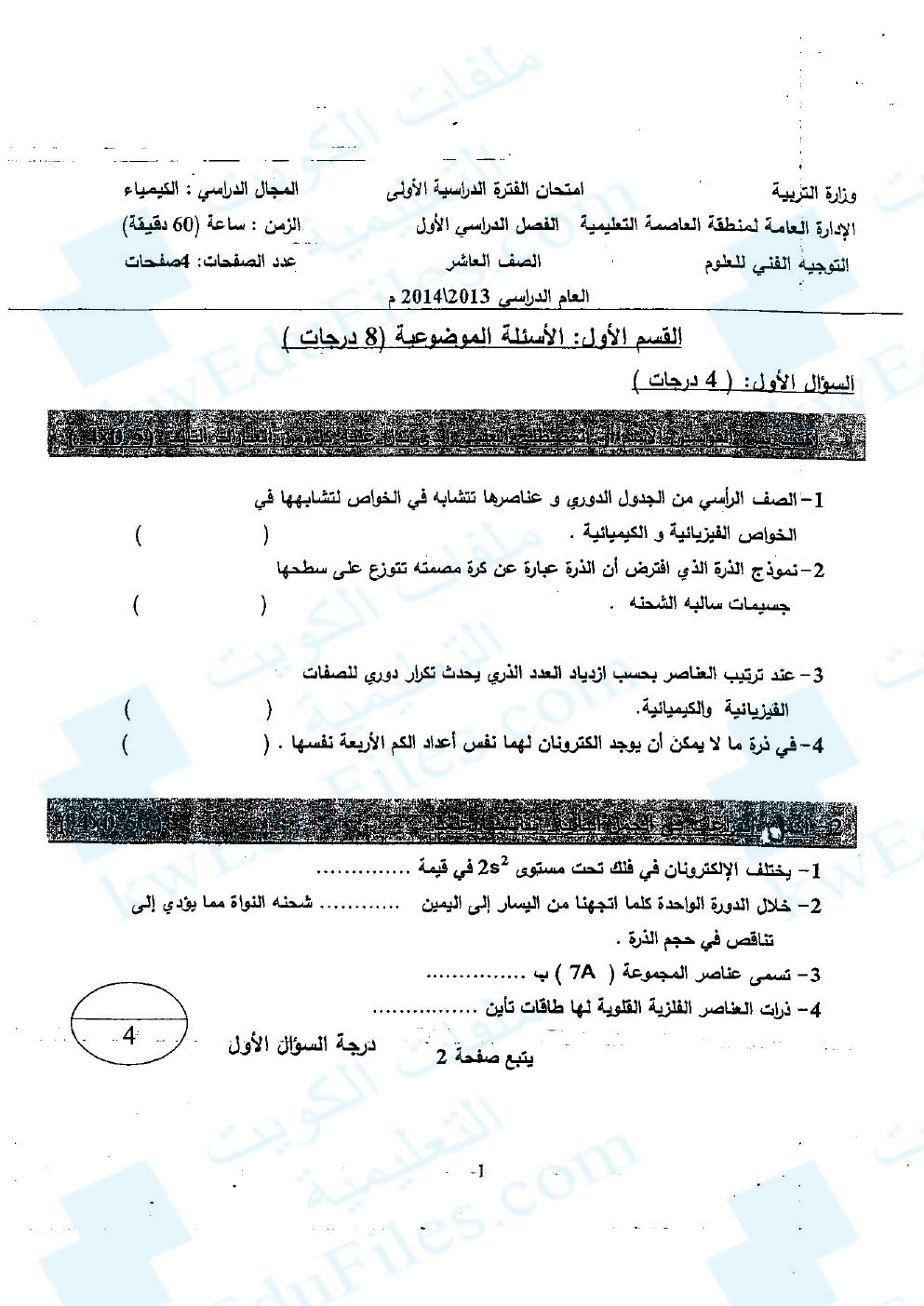 إليكم أسئلة امتحان الفترة الدراسية الاولى في مادة الكيمياء للصف العاشر وذلك وفق المنهاج الكويتي للعام الدراسي 2013-2014