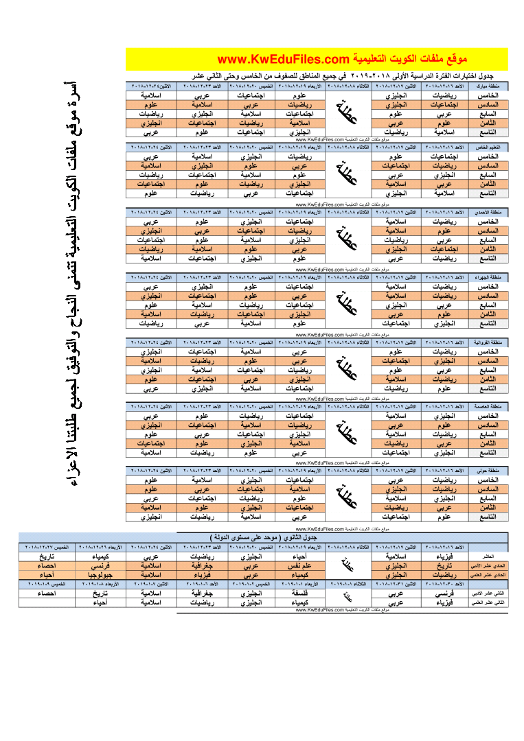 جدول اختبارات المرحلتين المتوسطة والثانوية للفترة الاولى في ورقة واحدة, أخبار, الامتحانات, الفصل الأول, 2018-2019 - المناهج الكويتية