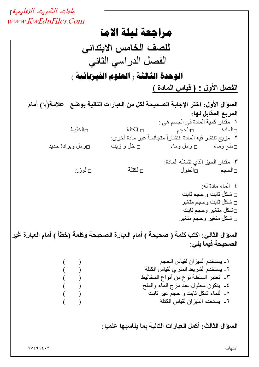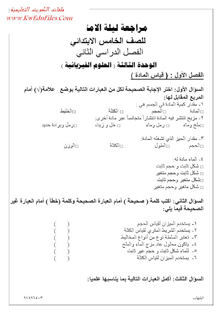 معلومات الملف: يحتوي الملف علىمراجعةفي مادة العلوم للصف الخامس للفصل الدراسي الثاني عدد اوراق هذا الملف 11 ورقة ويتضمن العلوم الفيزيائية | ||