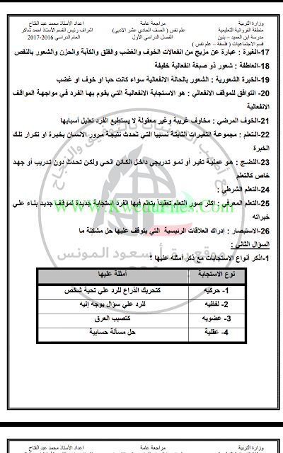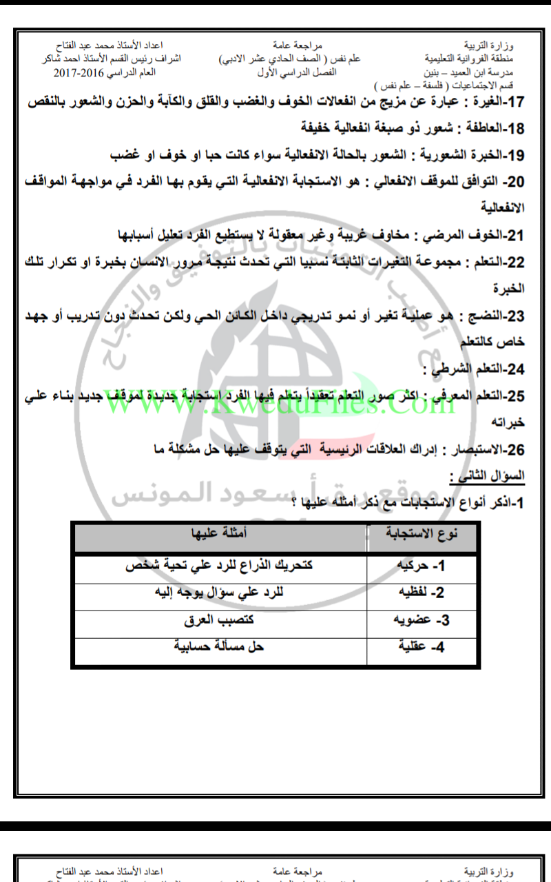 مراجعة مهمة في مادة علم النفس لطلاب الحادي عشر الادبي | ||