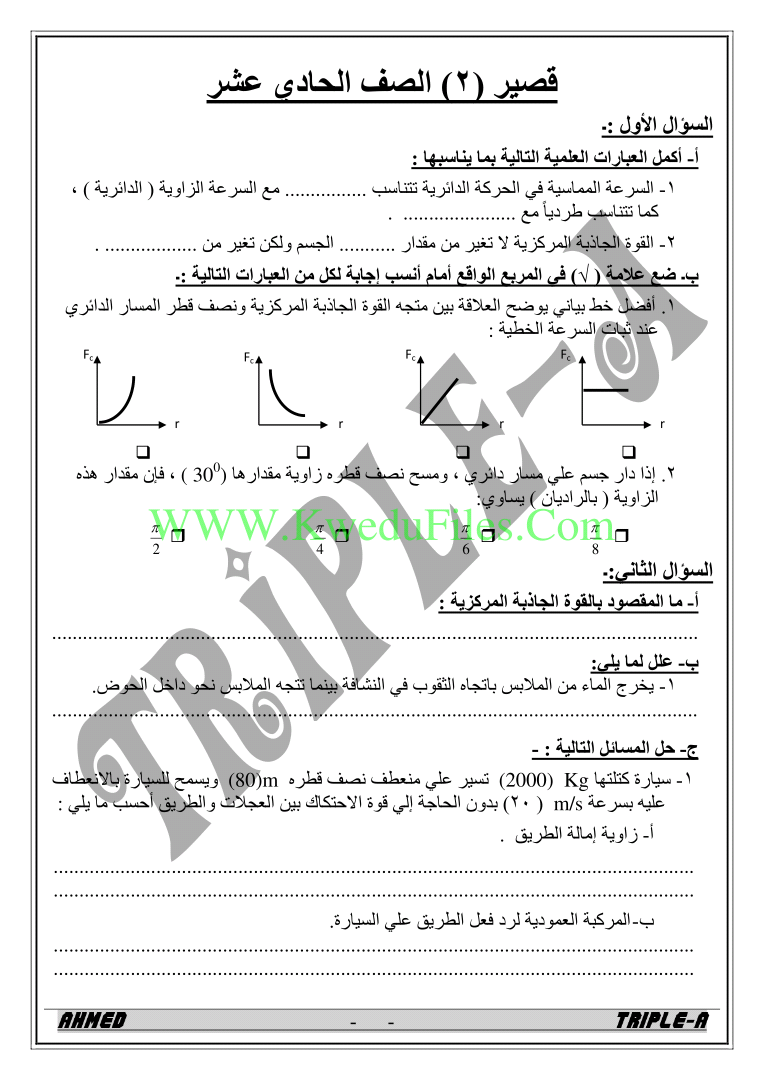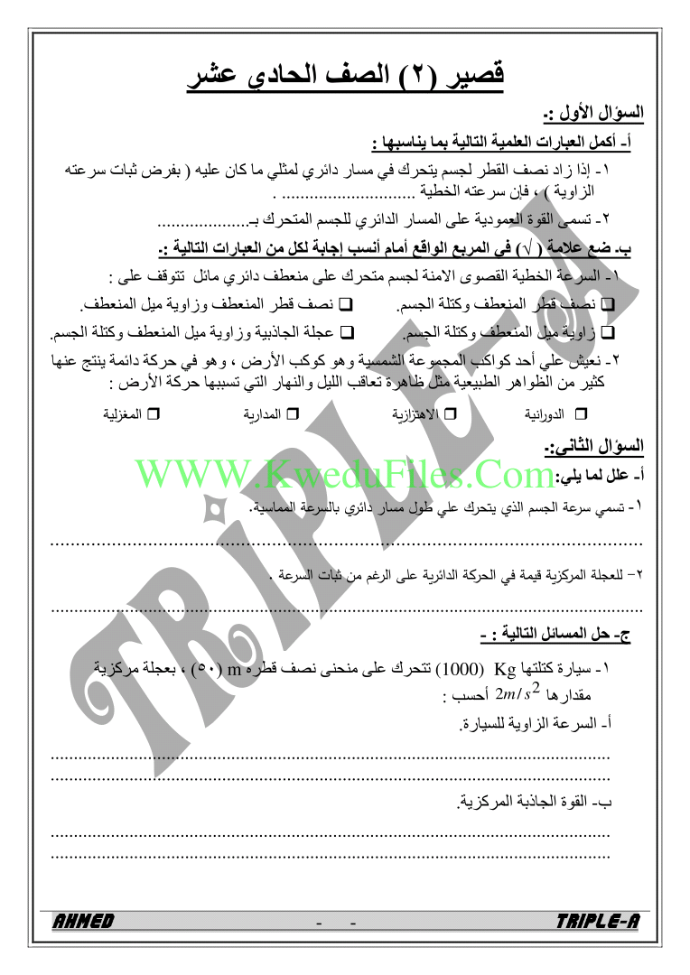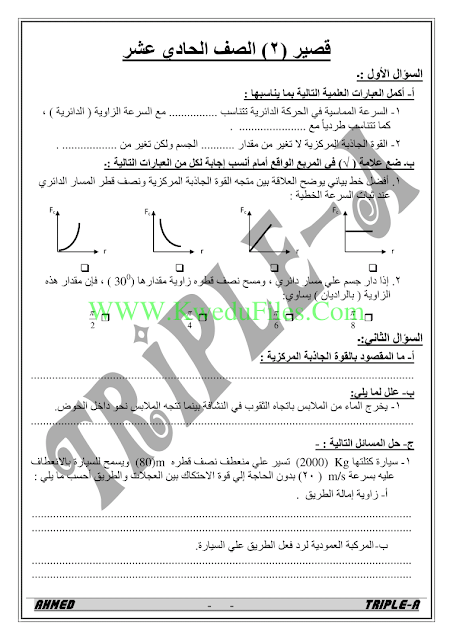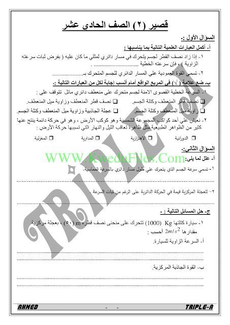 ورقتين في مادة الفيزياء للصف الحادي عشر العلمي للكورس الاول تتضمن نموذج اختبار قصير