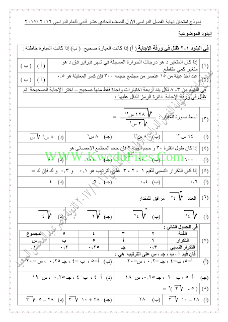 نموذج اختبار لنهاية الفترة الاولى في مادة الاحصاء | ||