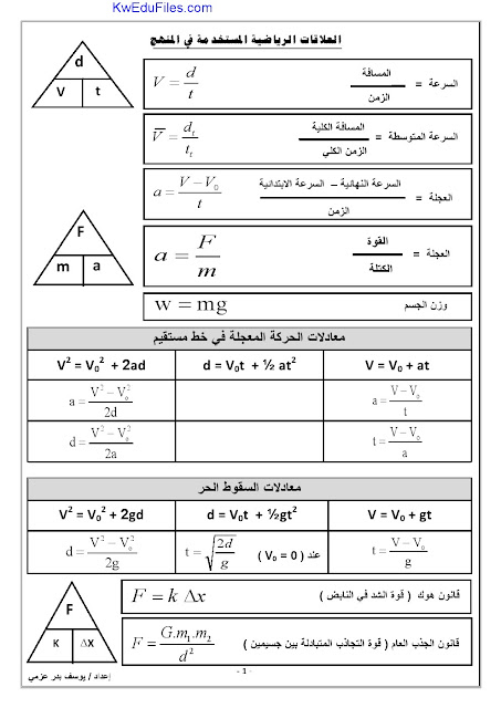 ملف مكون من صفحتين يضم أهم العلاقات الرياضية المستخدمة في الفصل الاول - مادة الكيمياء - العام الدراسي 2018-2019 وفق المنهاج الكويتي