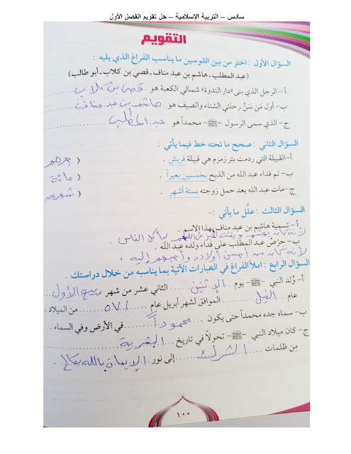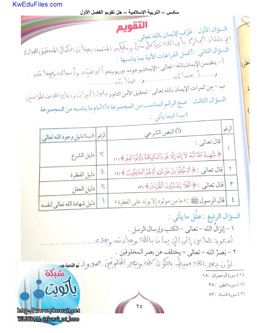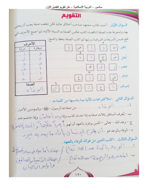 حل كامل تقويم الفصل الأول لامتحان التربية الاسلامية-  للصف السادس المتوسط -  للعام الدراسي 2017-2018