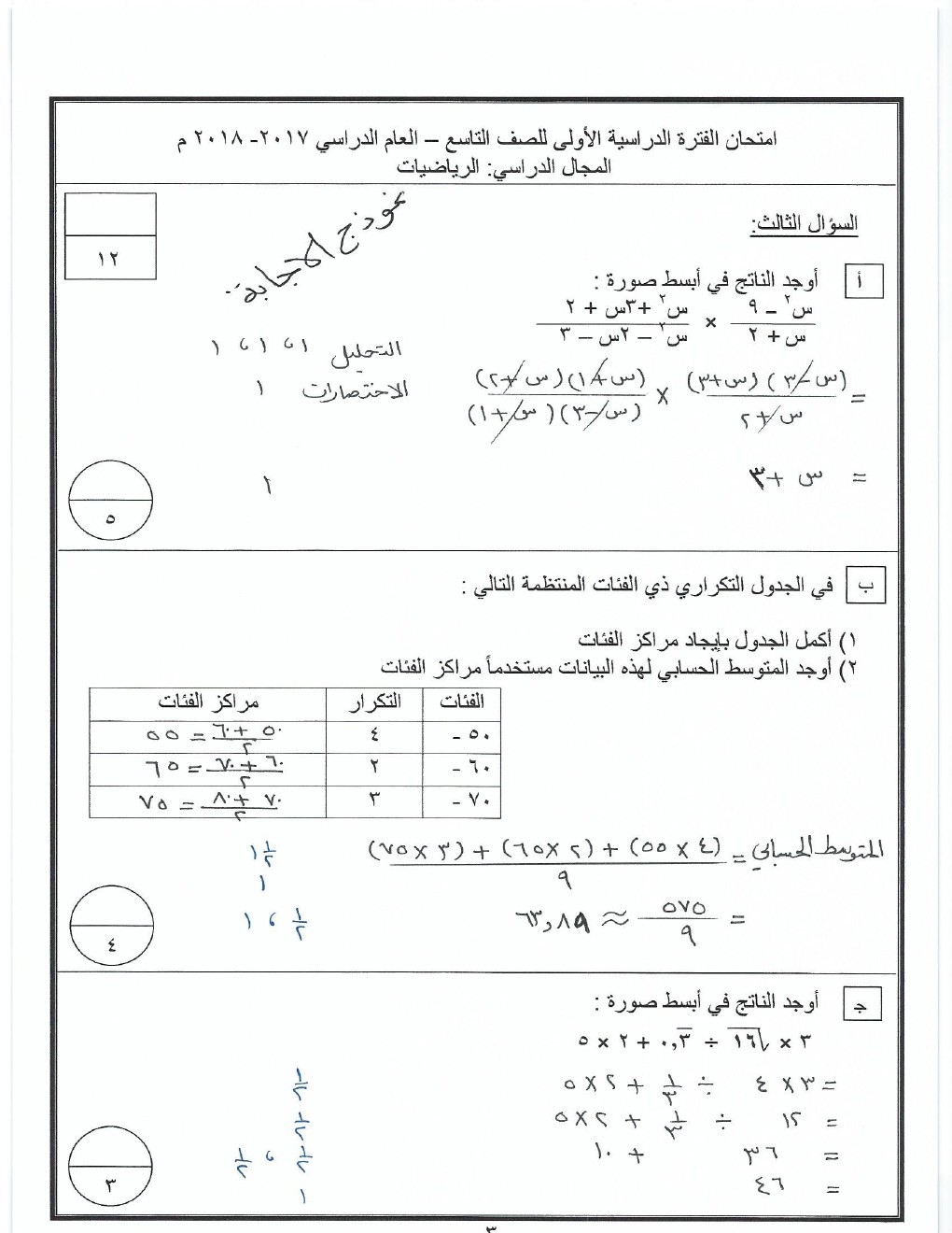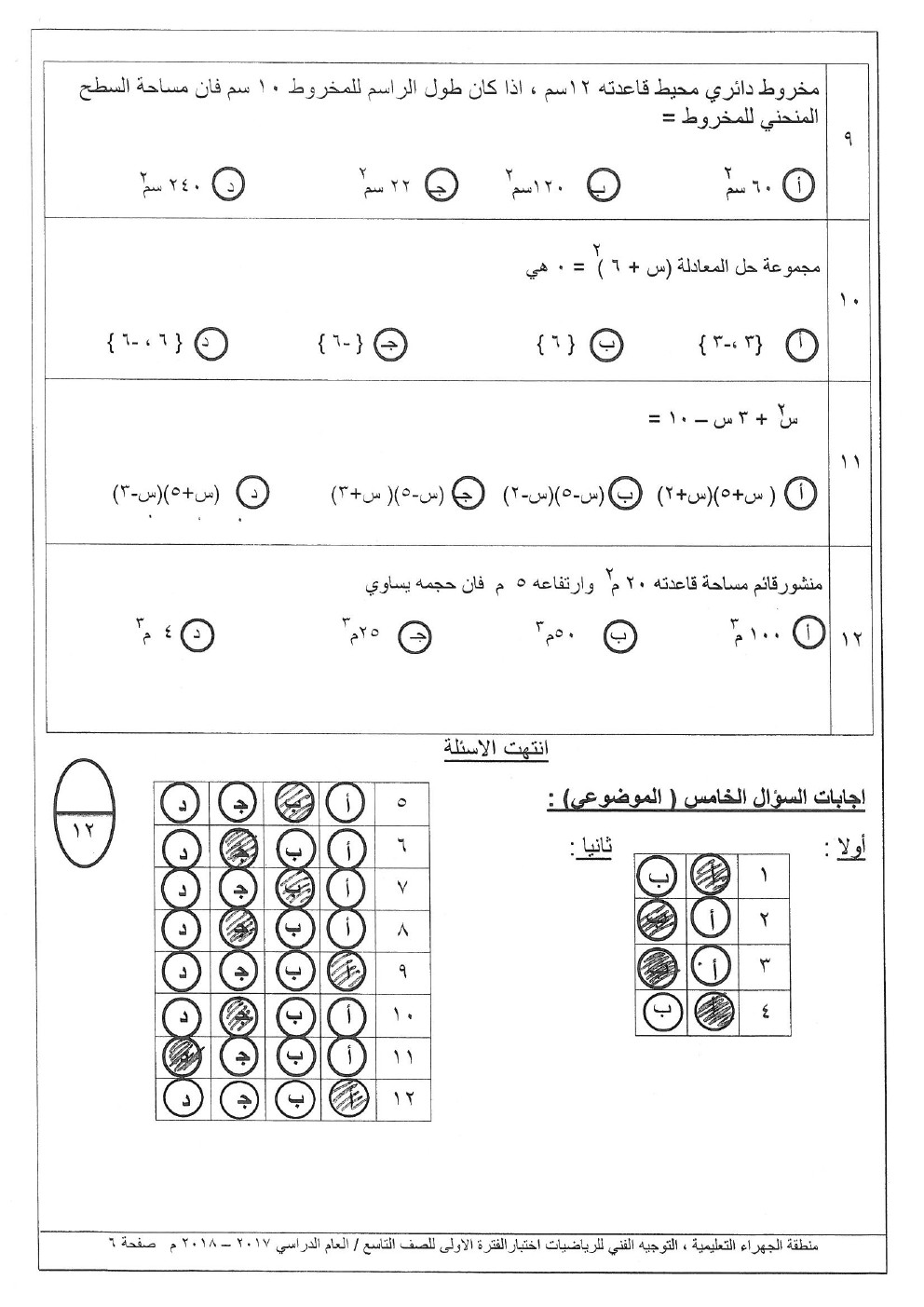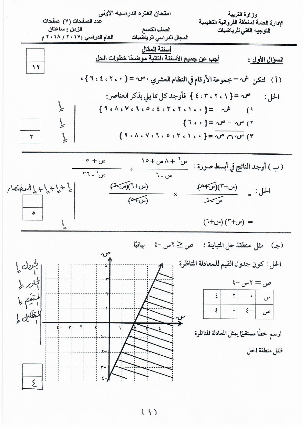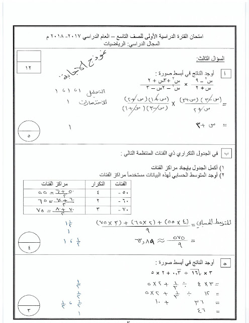 نموذج اجابة الاحمدي 20172018 في مادة الرياضيات للصف التاسع - الفصل الاول من العام الدراسي 2018-2019