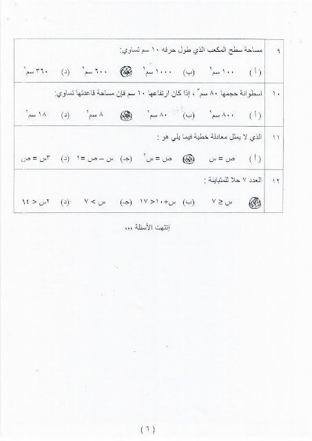 نموذج اجابة الفروانية 20192018 قسم تعليم الكبار في مادة الرياضيات للصف التاسع - الفصل الاول من العام الدراسي 2018-2019
