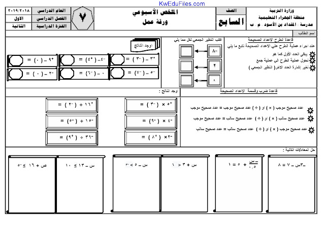 ورقة عمل العمليات على الاعداد الصحيحة- رياضيات - الفصل الاول من العام الدراسي 2018-2019 وفق المنهاج الكويتي