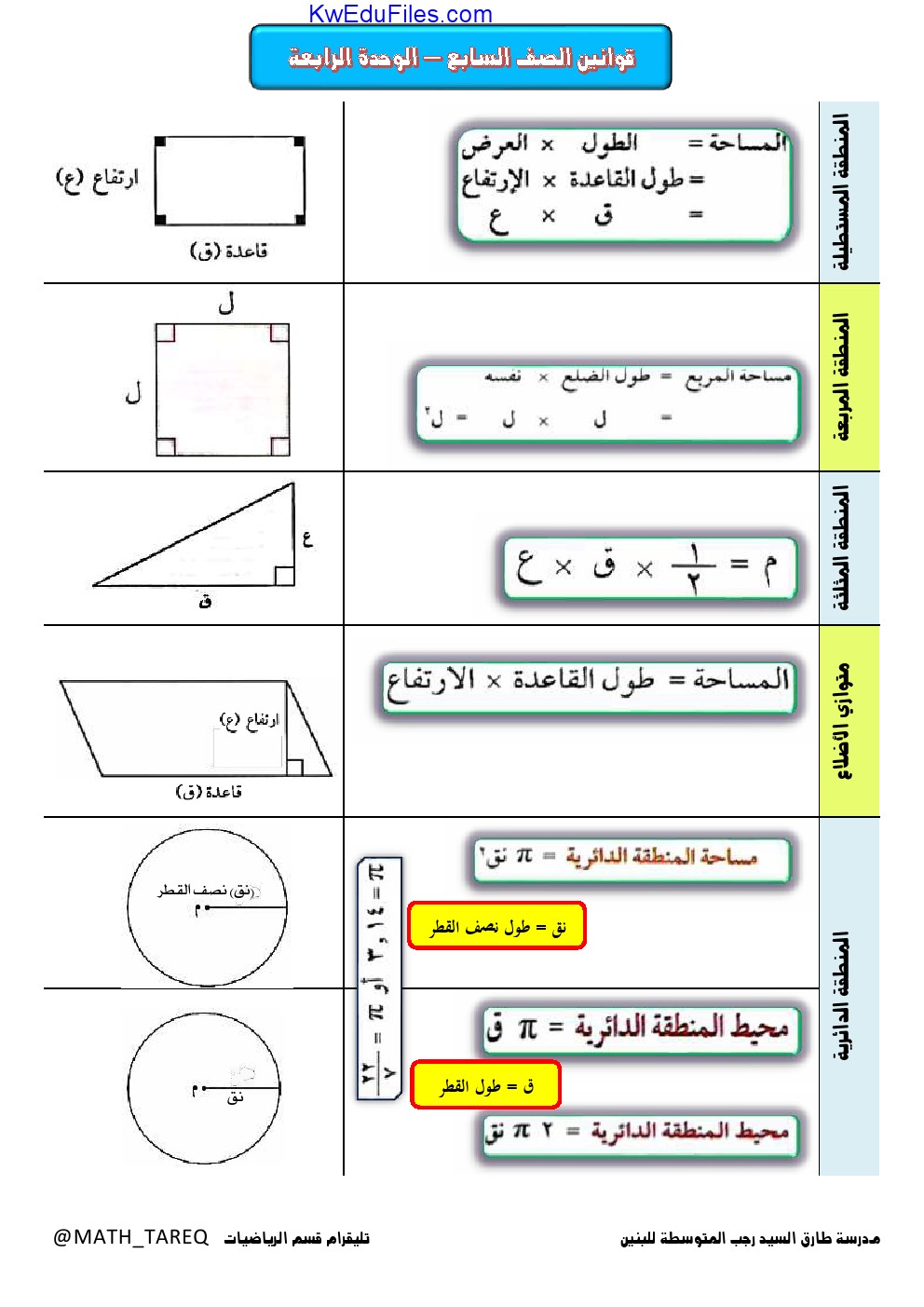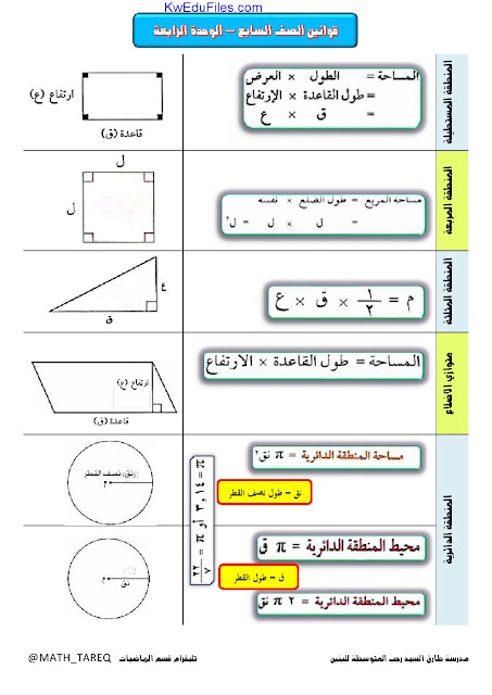 قوانين الوحدة الرابعة في صفحة واحدة- رياضيات - الفصل الاول من العام الدراسي 2018-2019 وفق المنهاج الكويتي
