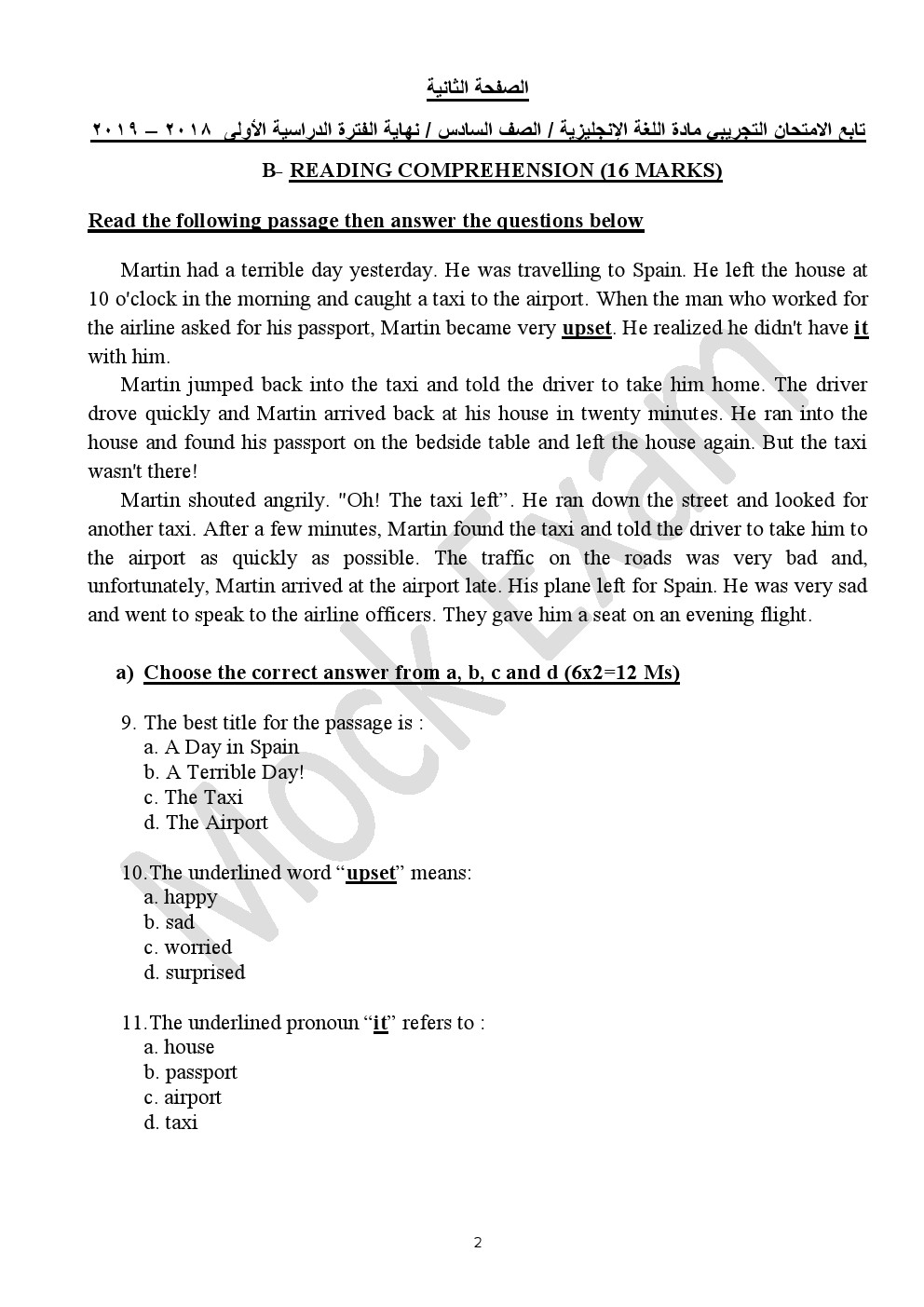 امتحان تجريبي من الفروانية 2018, منطقة الفروانية التعليمية, الصف السادس, لغة انجليزية, الفصل الأول, 2018-2019 - المناهج الكويتية