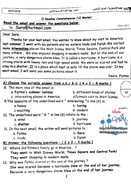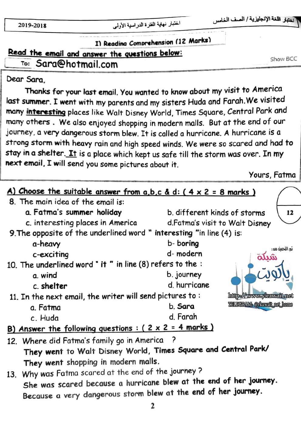 اسئلة العاصمة 2018, منطقة العاصمة التعليمية, الصف الخامس, لغة انجليزية, الفصل الأول, 2018-2019 - المناهج الكويتية