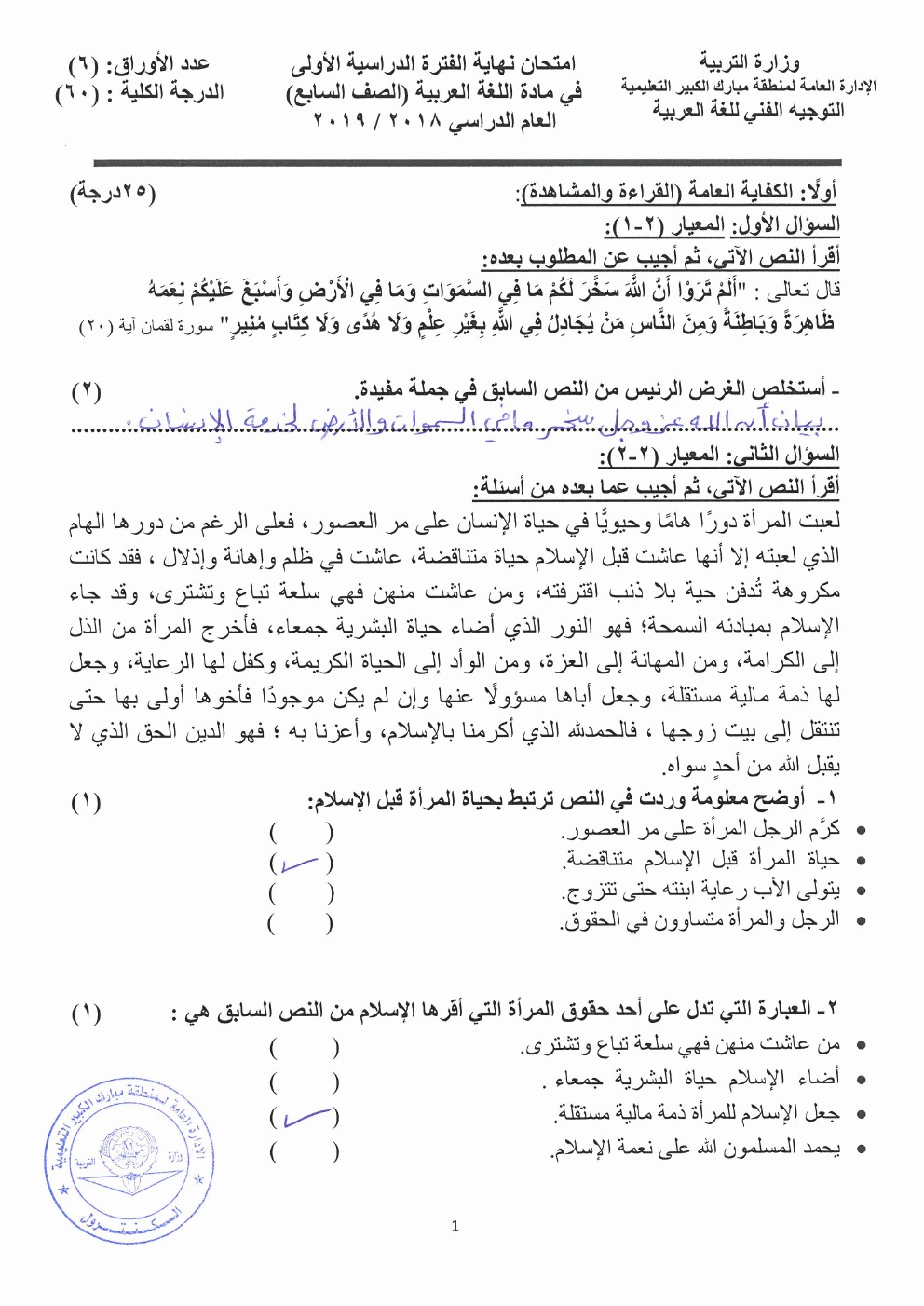 7. نموذج إجابة منطقة الفروانية التعليمية
