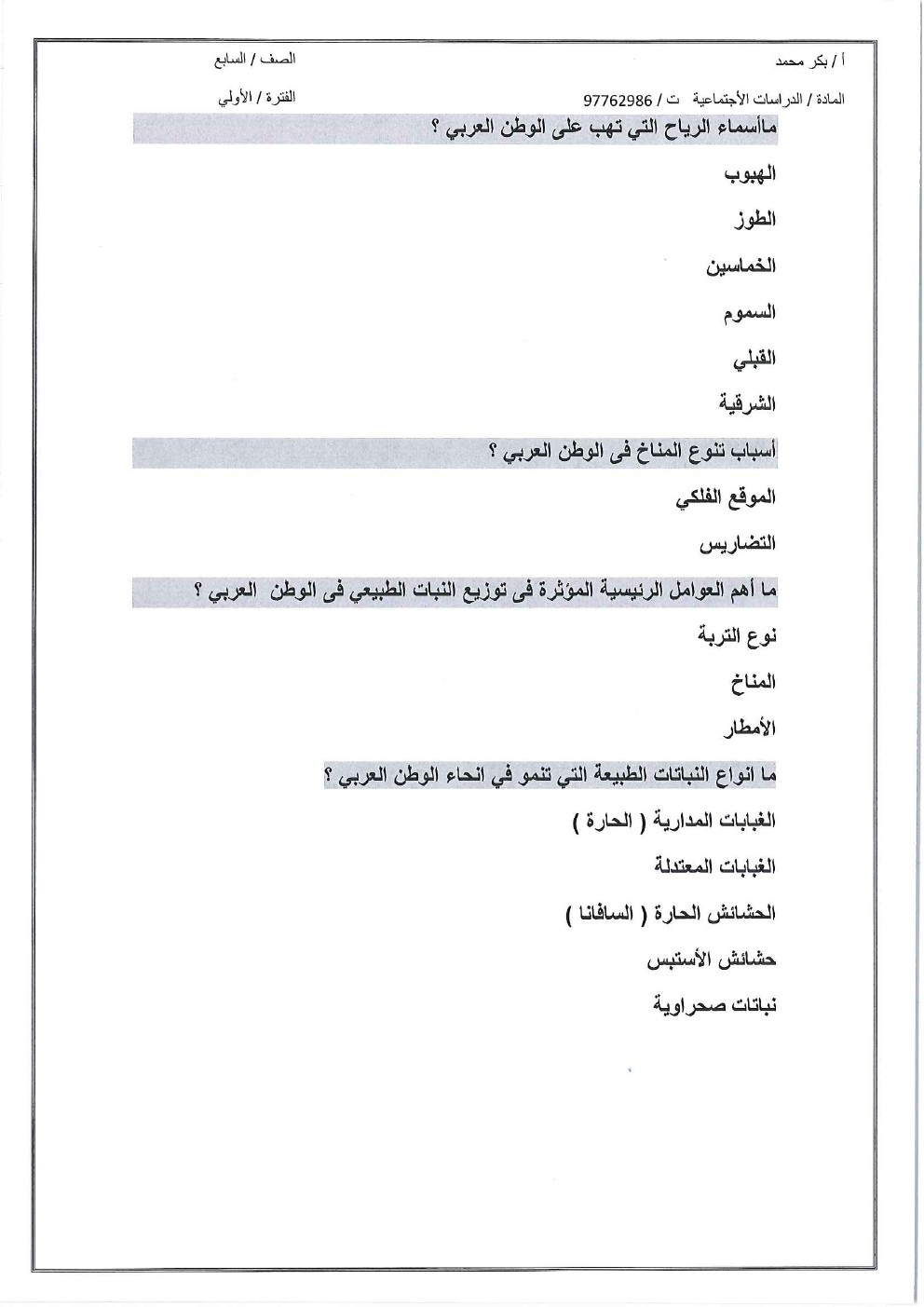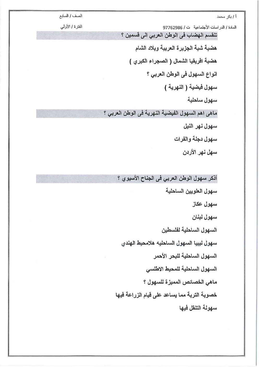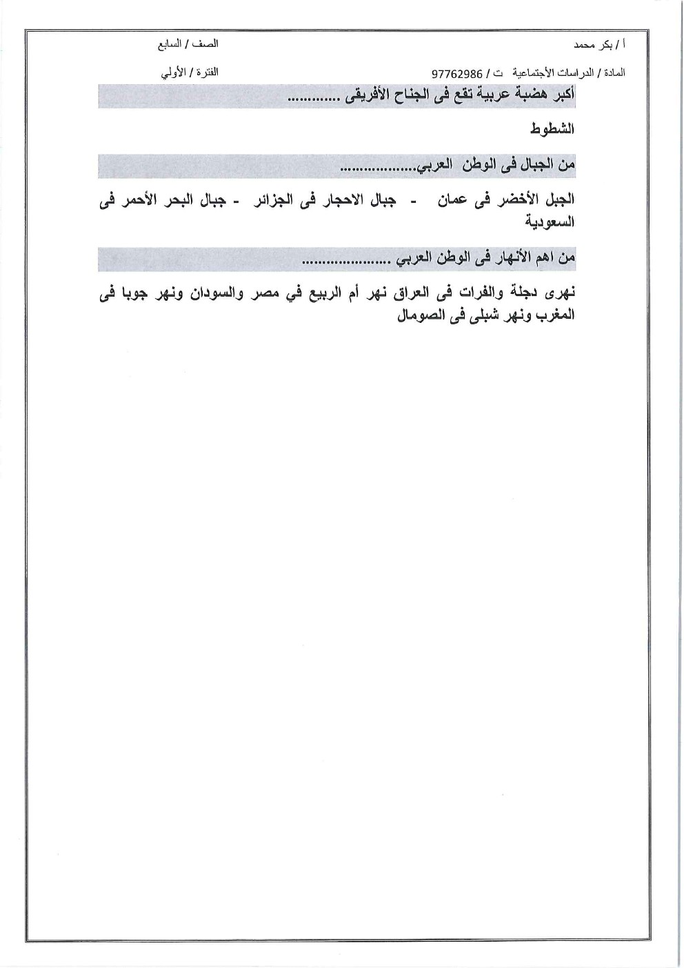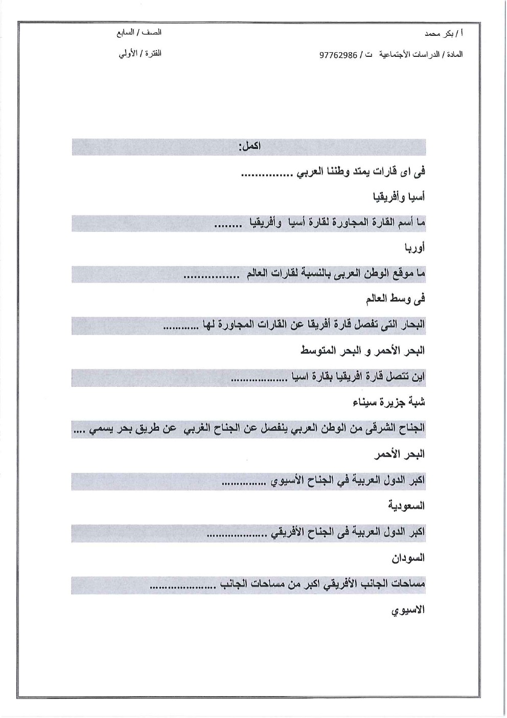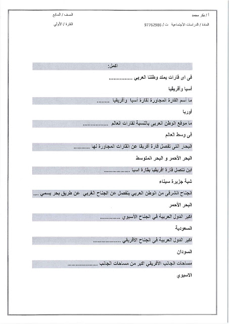 12. اجتماعيات, الفصل الأول, 2025-2026, أوراق عمل شاملة للوحدة الأولى (الوطن العربي وخصائصه الطبيعية)