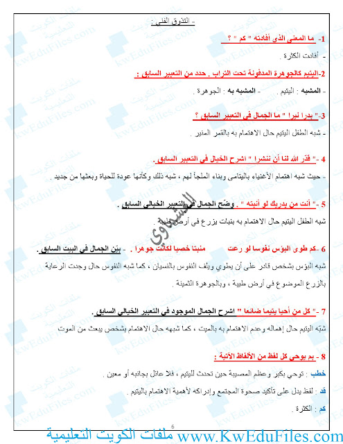 5. الصف السادس, لغة عربية, إجابة الاختبار النهائي لمنطقة حولي التعليمية