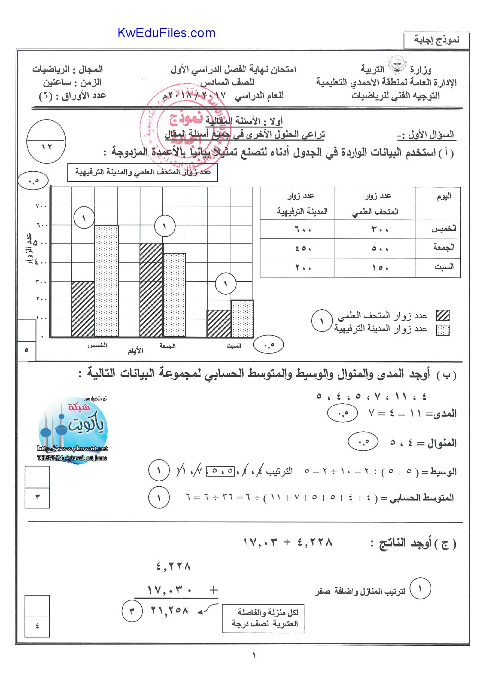 10. الصف السادس, رياضيات, نموذج اختبار تجريبي لمنطقة الفروانية التعليمية