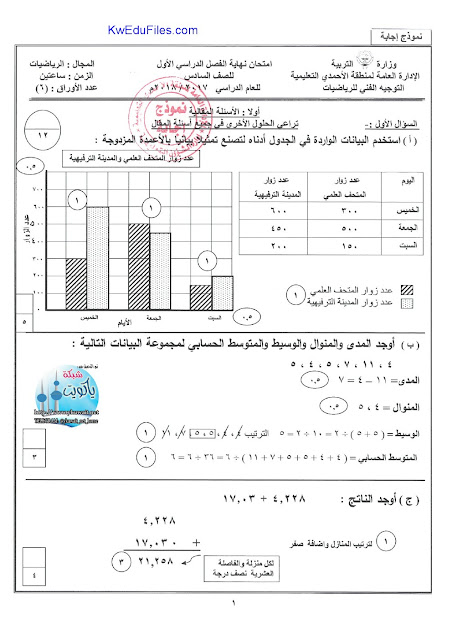 11. الصف السادس, رياضيات, نموذج اختبار قصير لمنطقة الجهراء التعليمية