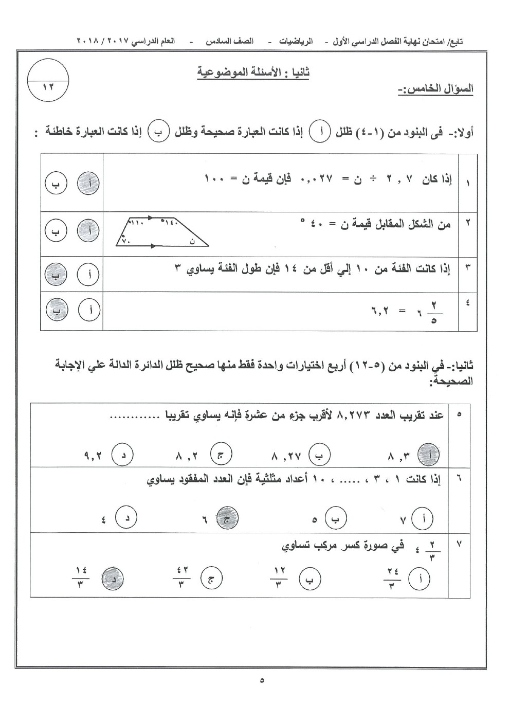 12. الصف السادس, رياضيات, نموذج اختبار تجريبي لنهاية العام