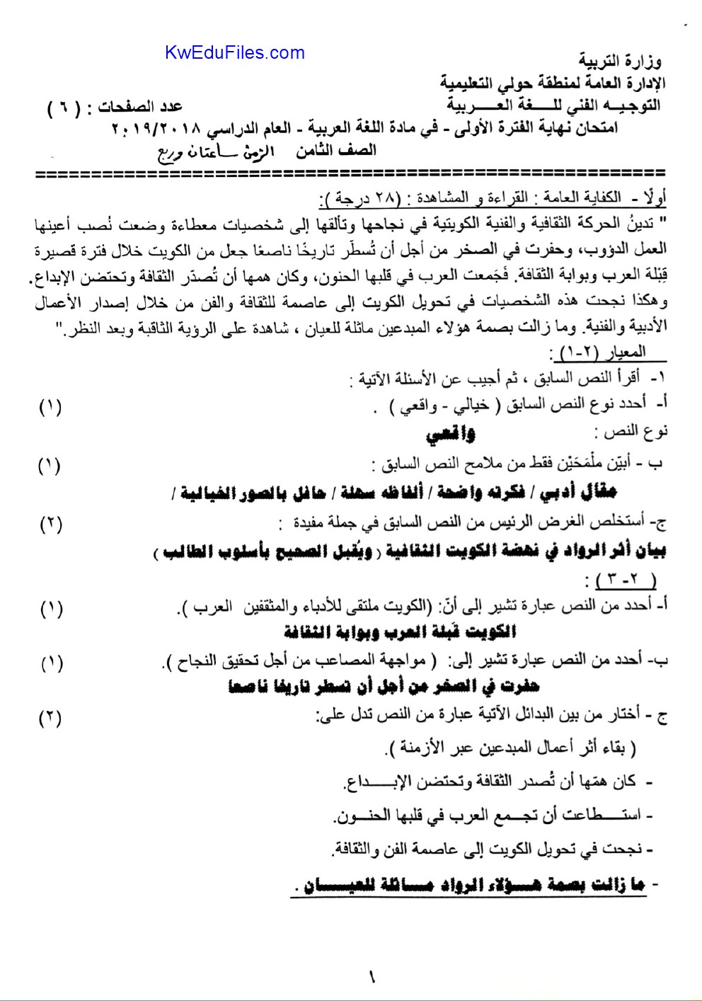 نموذج اجابة منطقة حولي 2018, منطقة حولي التعليمية, الصف الثامن, لغة عربية, الفصل الأول, 2018-2019 - المناهج الكويتية