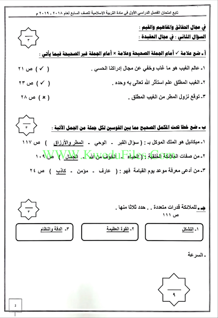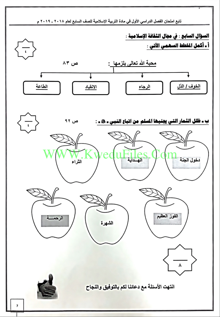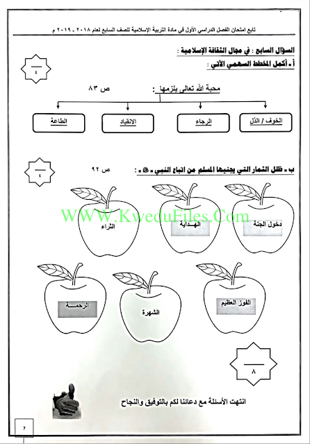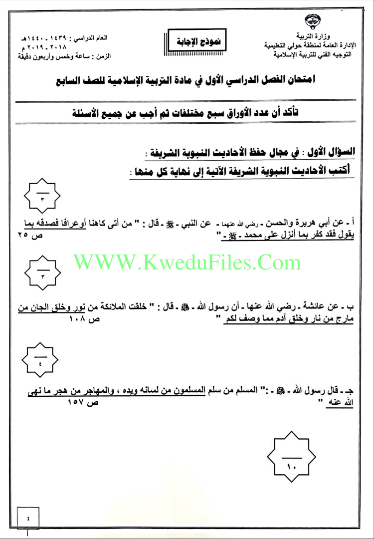 معلومات الملف: 8اوراق في مادة التربية الاسلامية لصف السابع للكورس الاول تتضمن نموذج اجابة منطقة حولي2018_2019 | ||