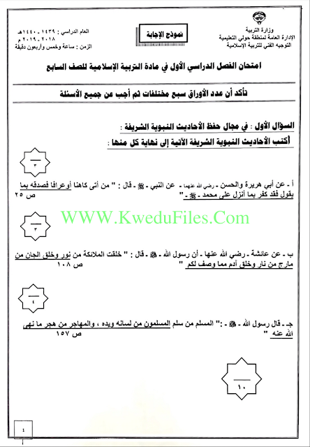 نموذج اجابة منطقة حولي في مادة التربية الاسلامية لعام2018_ | ||