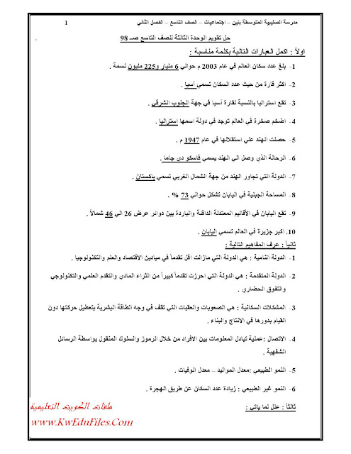 1. الصف التاسع, رياضيات, حل مراجعة التقويمي الأول