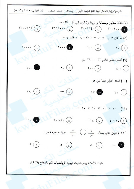 12. نموذج أسئلة منطقة الفروانية التعليمية