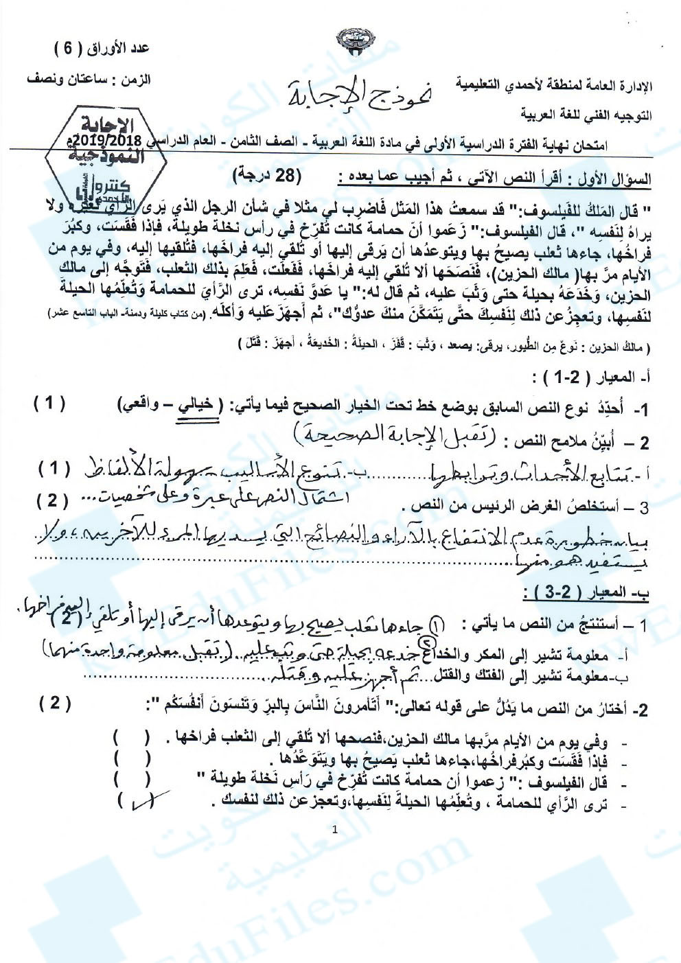 تم إيجاد الملف: نموذج اجابة الاحمدي 20172018