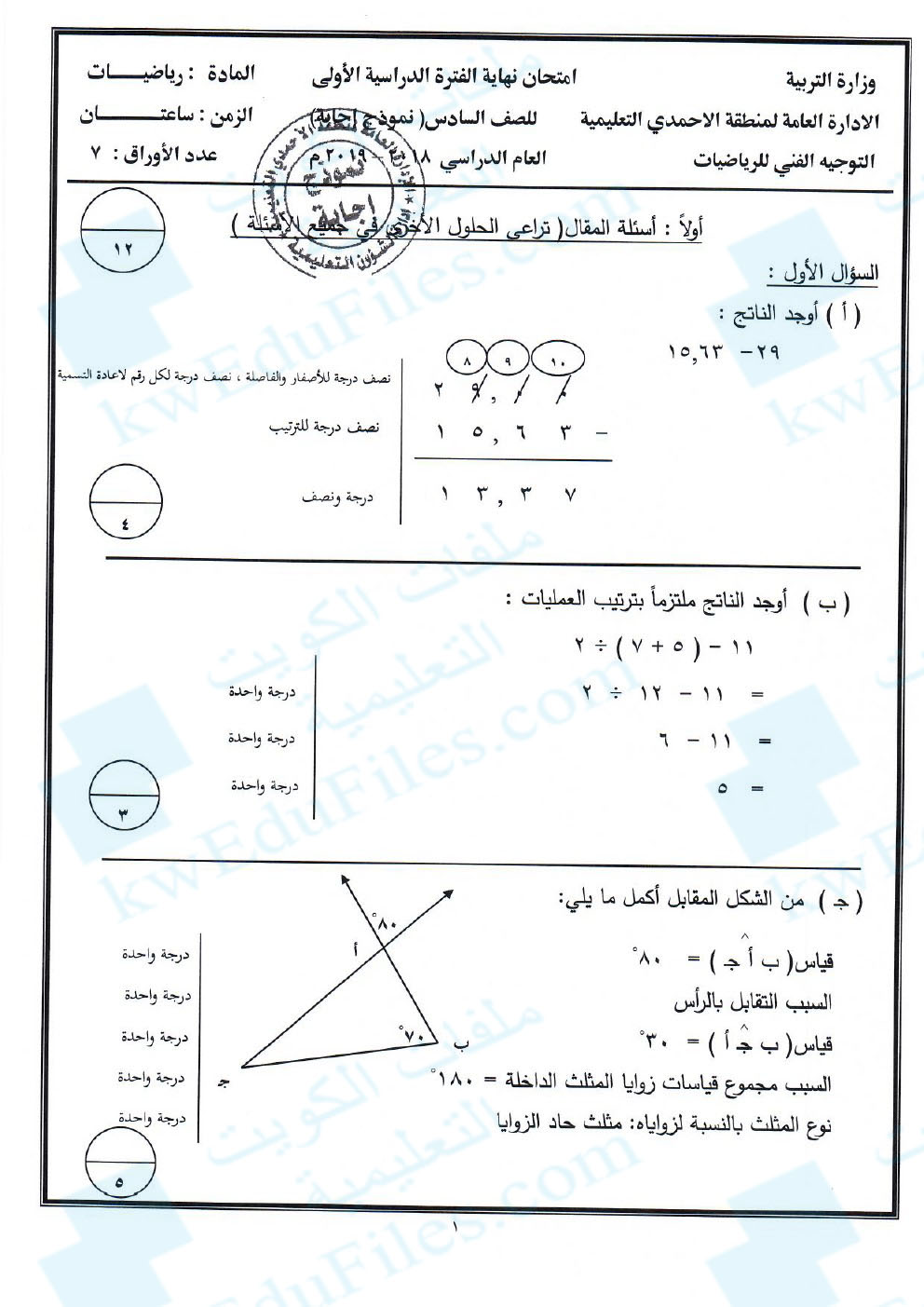 7. نموذج إجابة منطقة الأحمدي التعليمية