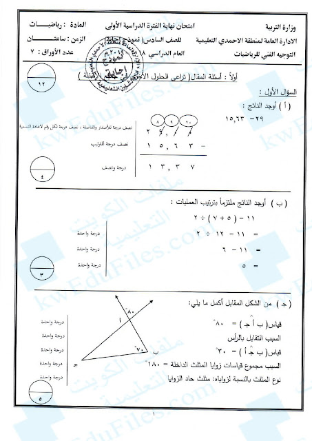 14. أسئلة امتحان الرياضيات لمنطقة الجهراء