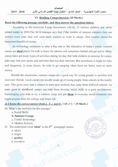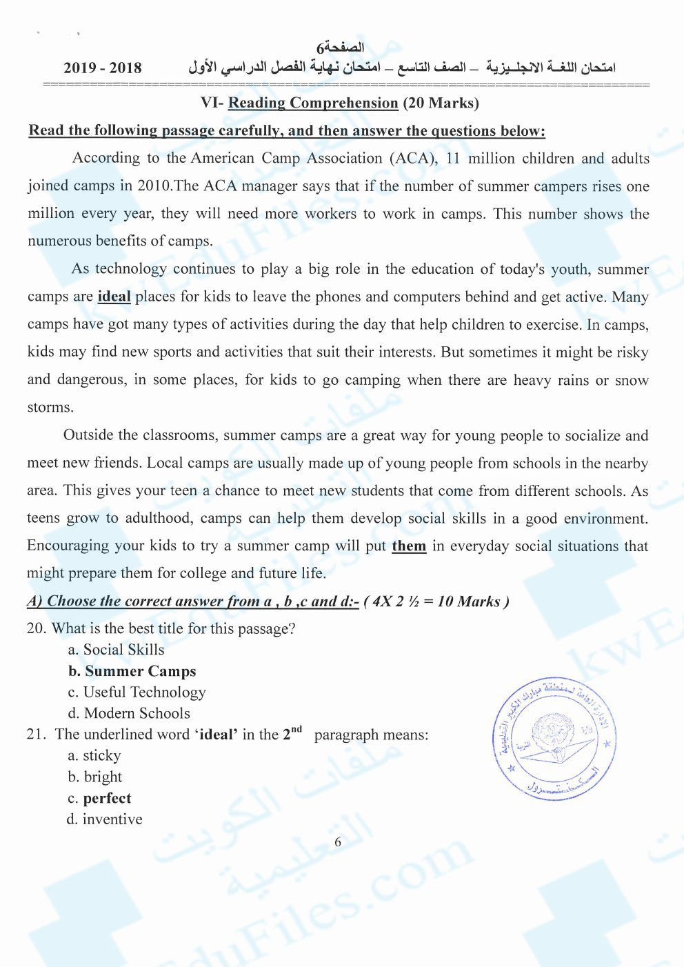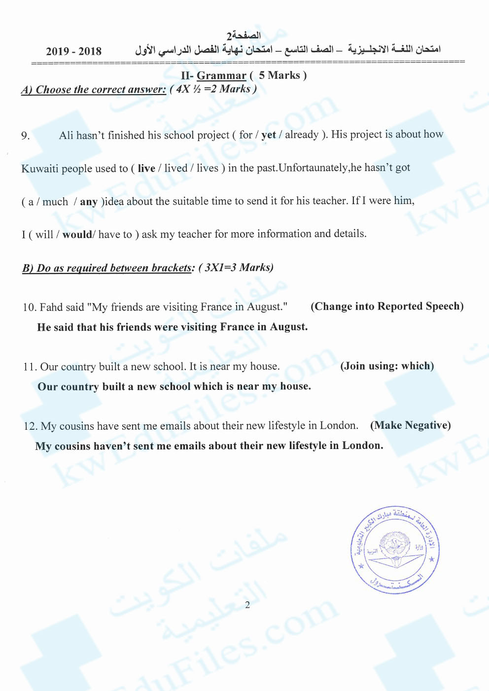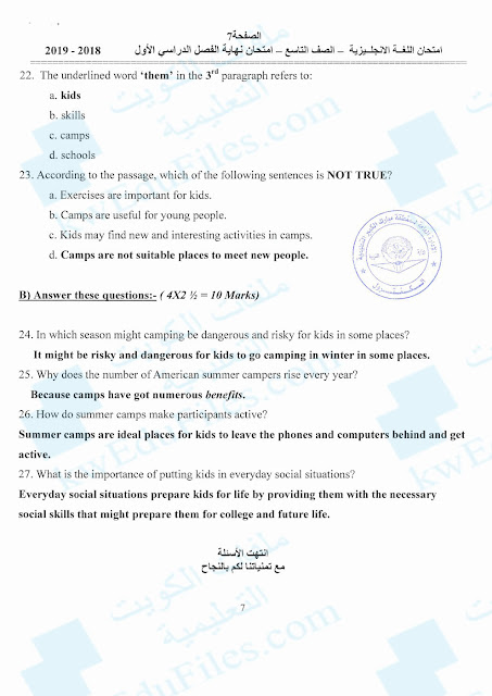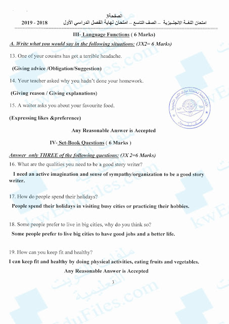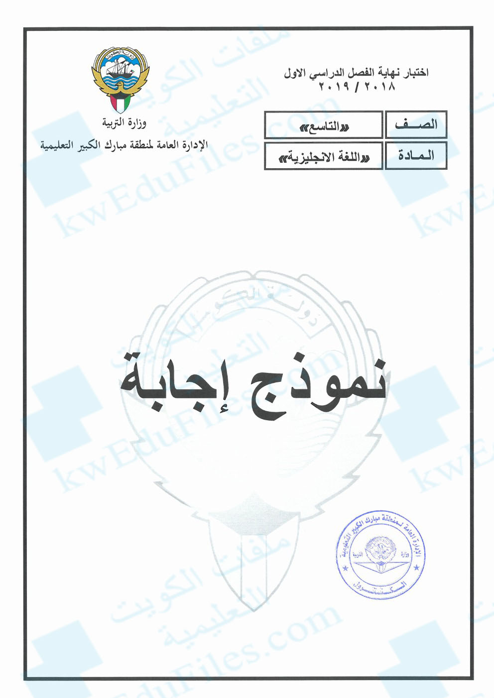 نموذج اجابة منطقة مبارك التعليمية 2018 /, منطقة مبارك الكبير التعليمية, الصف التاسع, لغة انجليزية, الفصل الأول, 2018-2019 - المناهج الكويتية