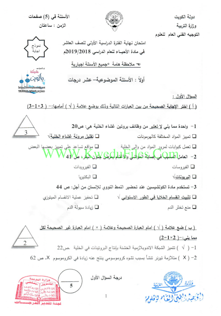 نموذج اجابة عام 2018/2019في مادة الاحياء للصف العاشر