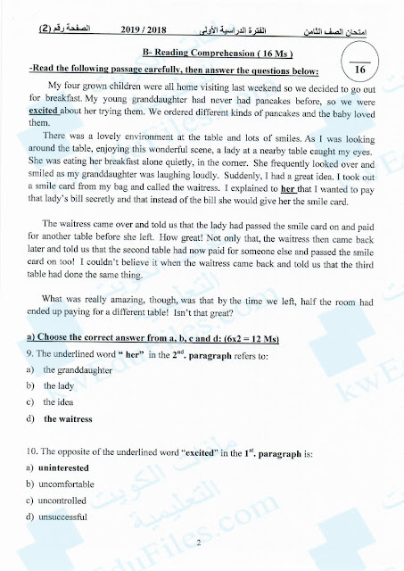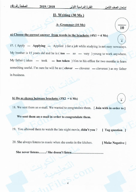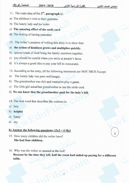 13. نموذج إجابة اختبار منطقة الجهراء التعليمية