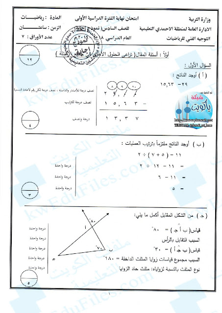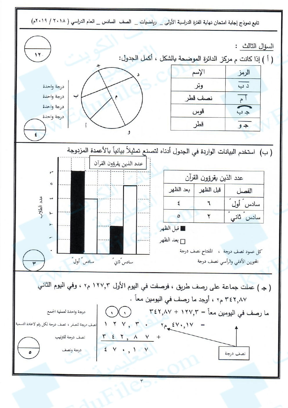 14. الصف الأول, رياضيات, الاختبار التقويمي الأول