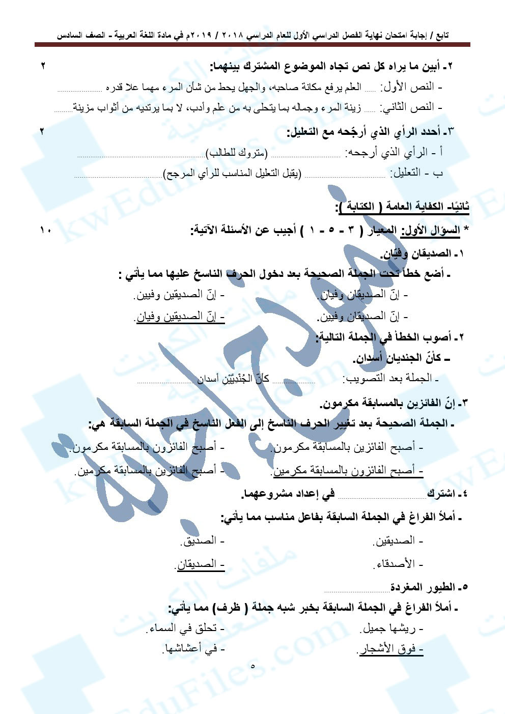 5. إجابة الاختبار النهائي لمنطقة الفروانية التعليمية
