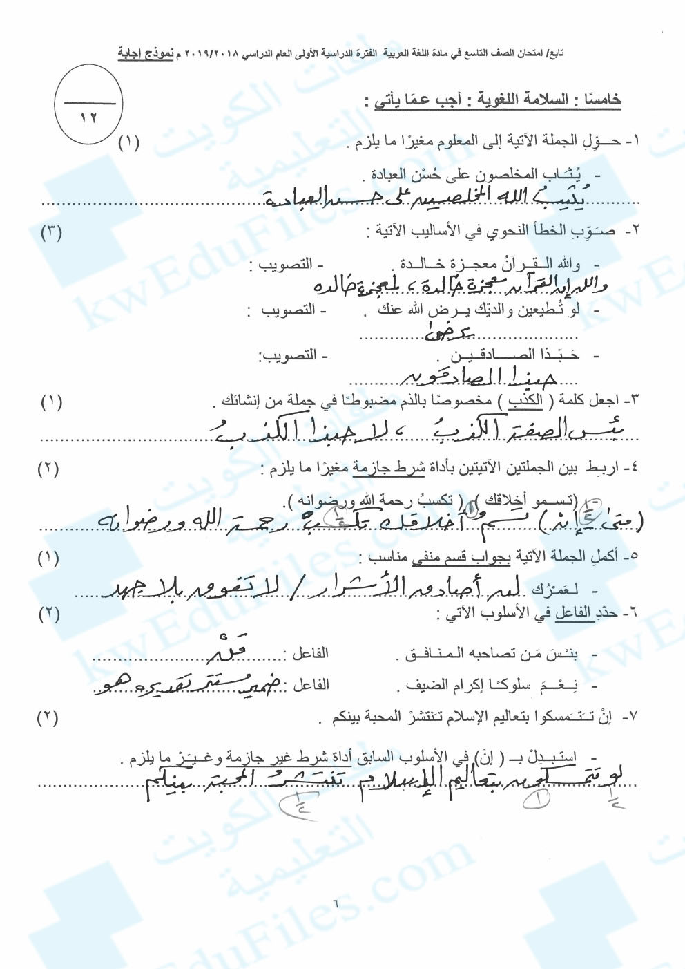 نموذج اجابة منطقة حولي 2018 / 2019