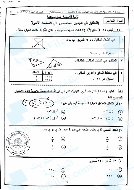 8. رياضيات, الفصل الأول, 2025-2026, نماذج اختبارات تقويمية