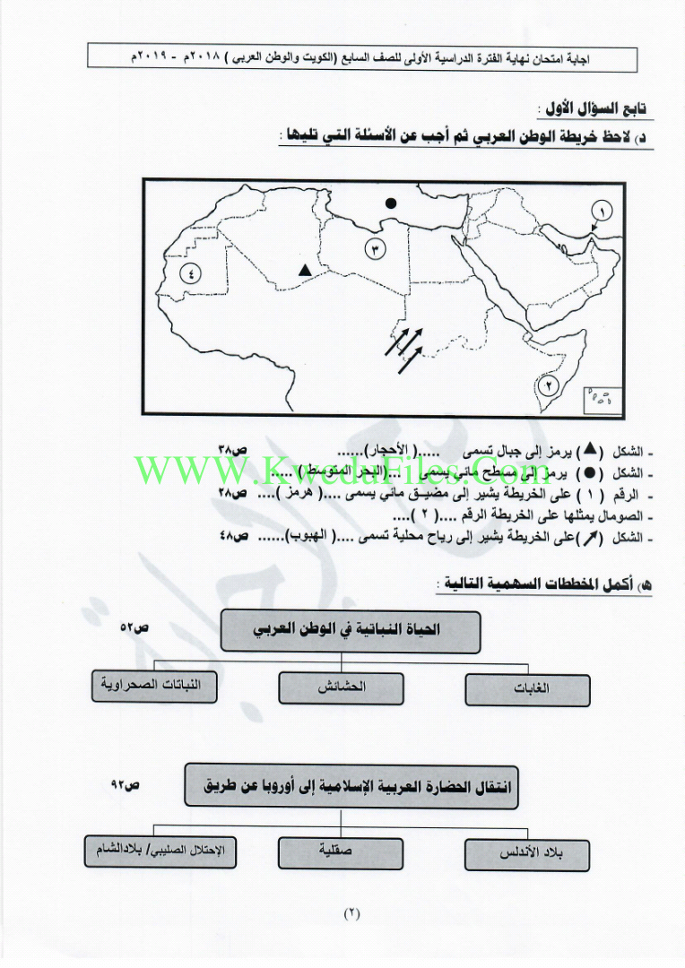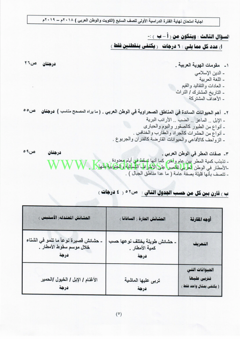 نموذج اجابة منطقة الفروانيةلعام 2018/2019في مادة الاجتماعيات للصف السابع