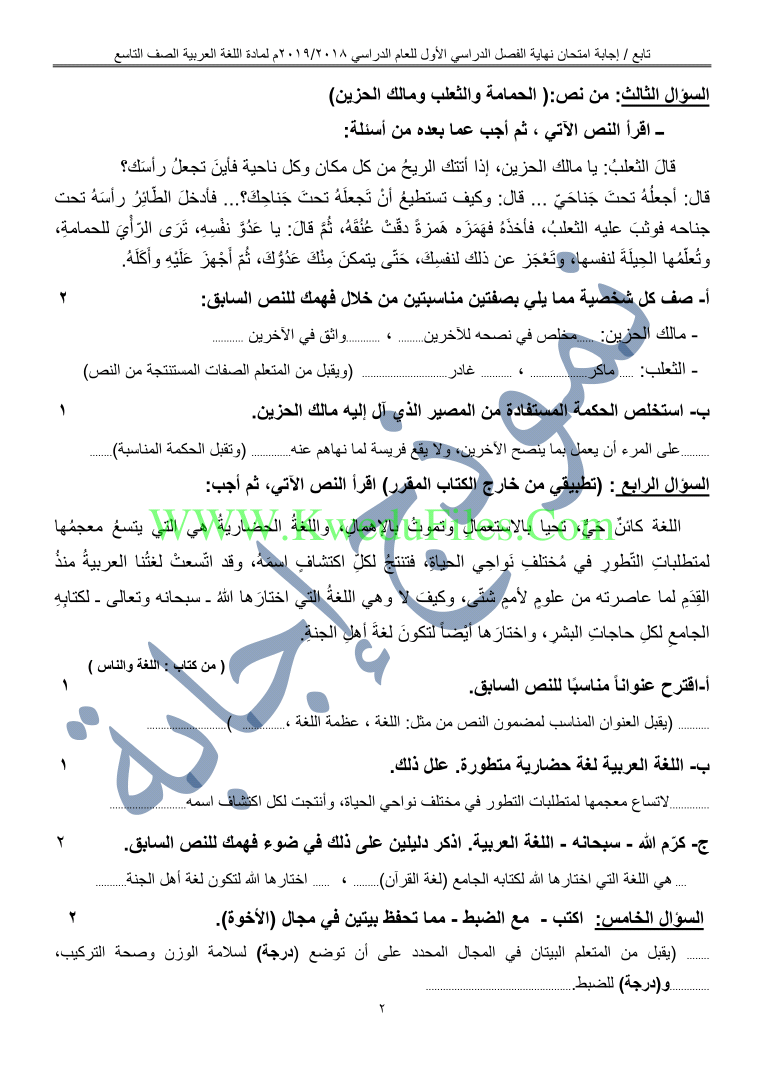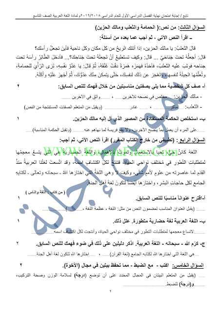 نموذج اجابة تعليم خاص لمادة اللغة العربية 2018/2019للصف التايع
