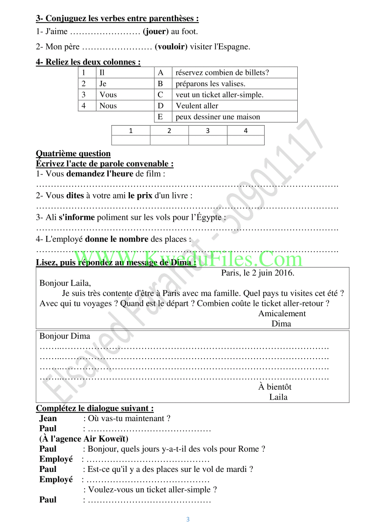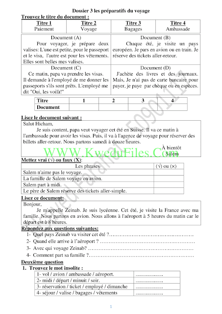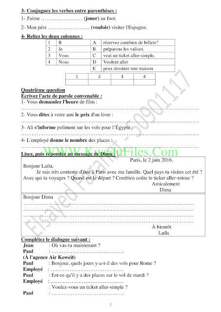 نموذج اختبار للوحدة الثالثة في مادة اللغة الفرنسية