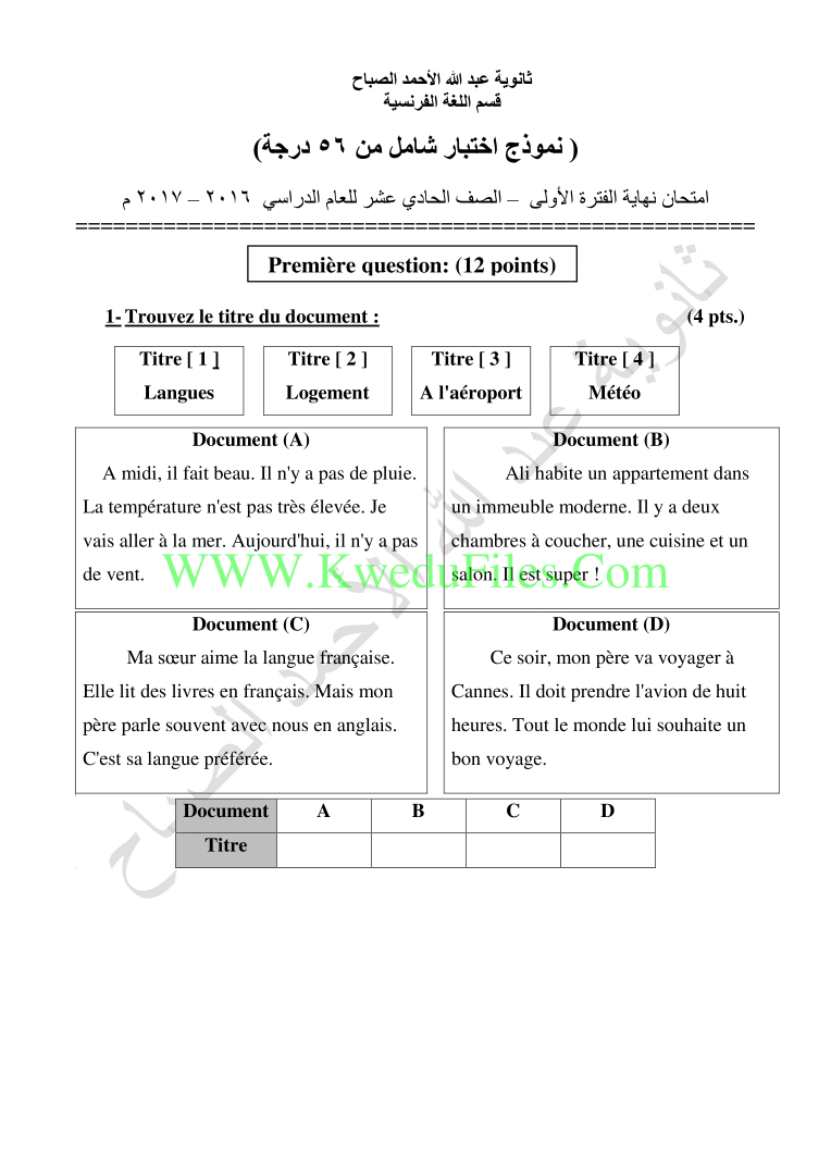 معلومات الملف: نموذج اختبار شامل في مادة اللغة الفرنسية للصف الحادي عشر للكورس الاول تتضمن نموذج اختبار شامل | ||