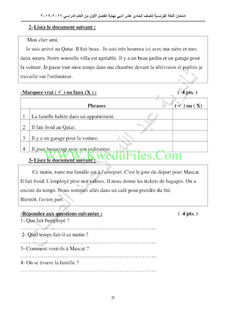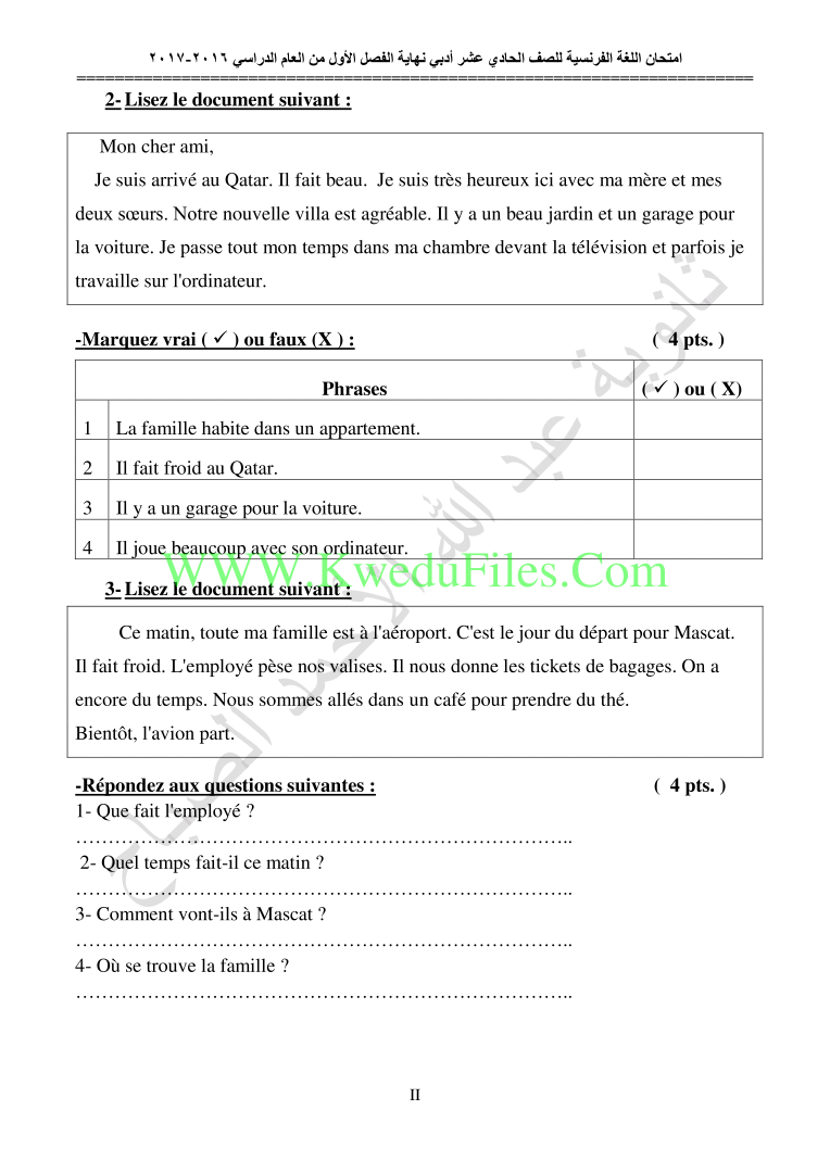 | أنت هنا: موقع المناهج ⇦ المناهج الكويتية ⇦ الصف الحادي عشر الأدبي ⇦ لغة فرنسية ⇦ الفصل الأول ⇦ الامتحان النهائي |