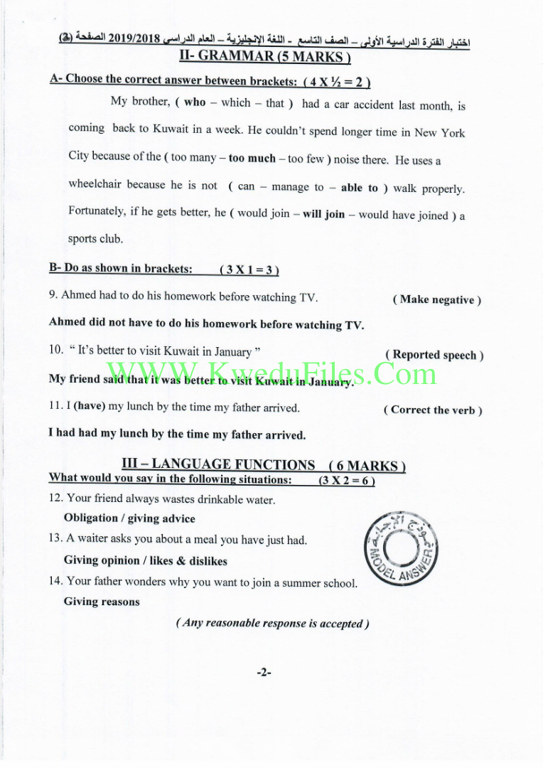 نموذج اجابة منطقة الفروانية, الصف التاسع, لغة انجليزية, الفصل الأول, 2018-2019 - المناهج الكويتية