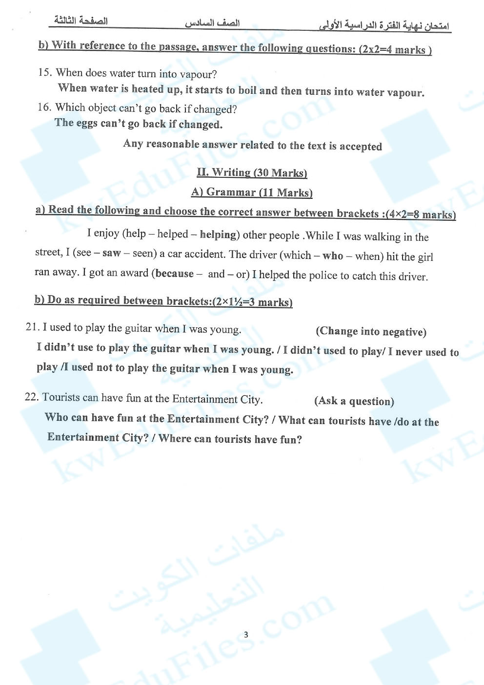 11. نموذج إجابة امتحان الفترة الأولى منطقة الجهراء التعليمية