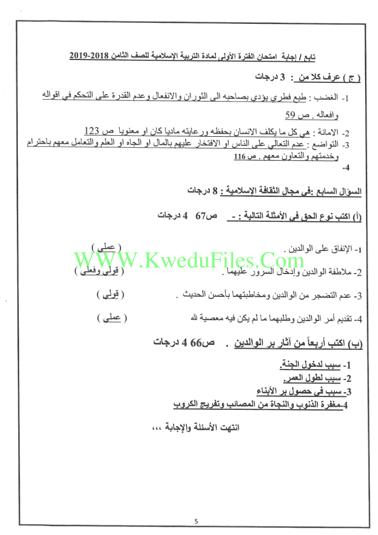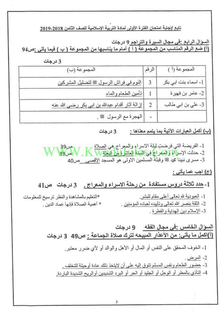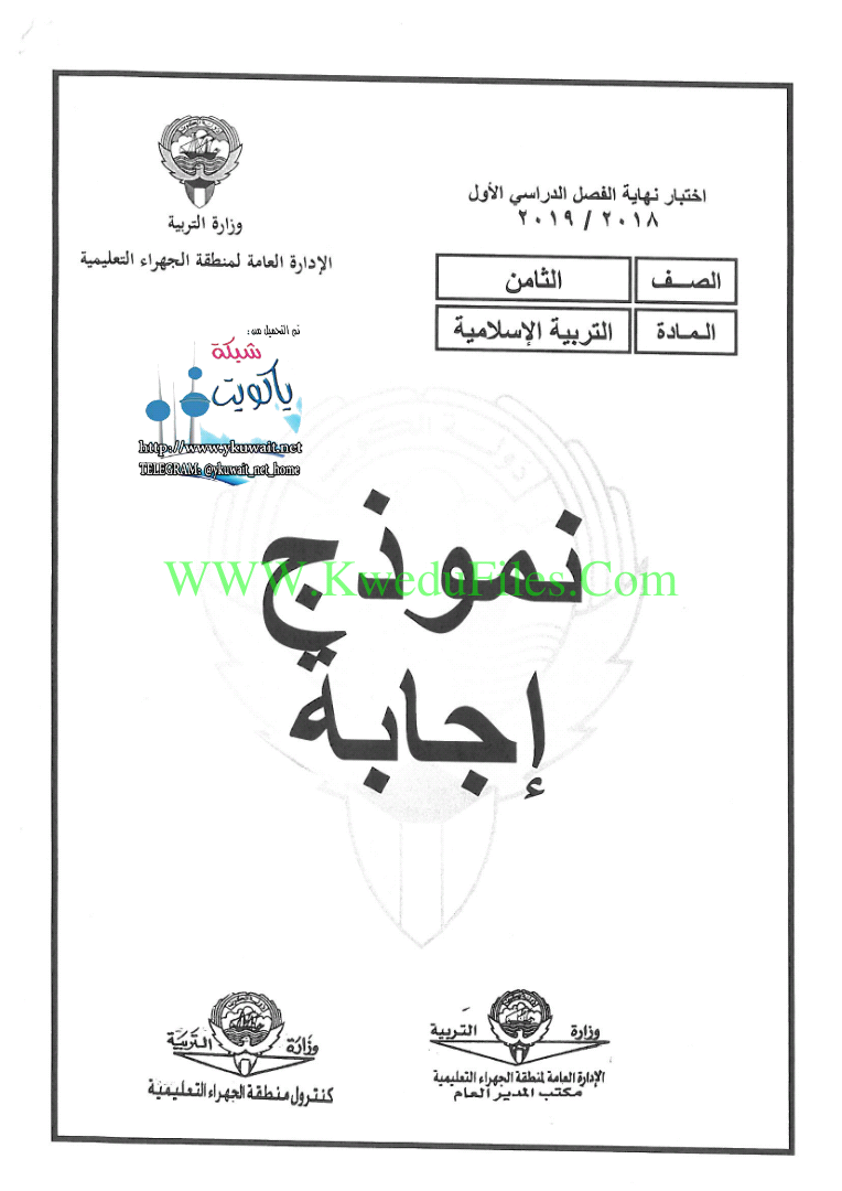 نموذج اجابة منطقة الجهراء لمادة التربية الاسلامية2018/2019
