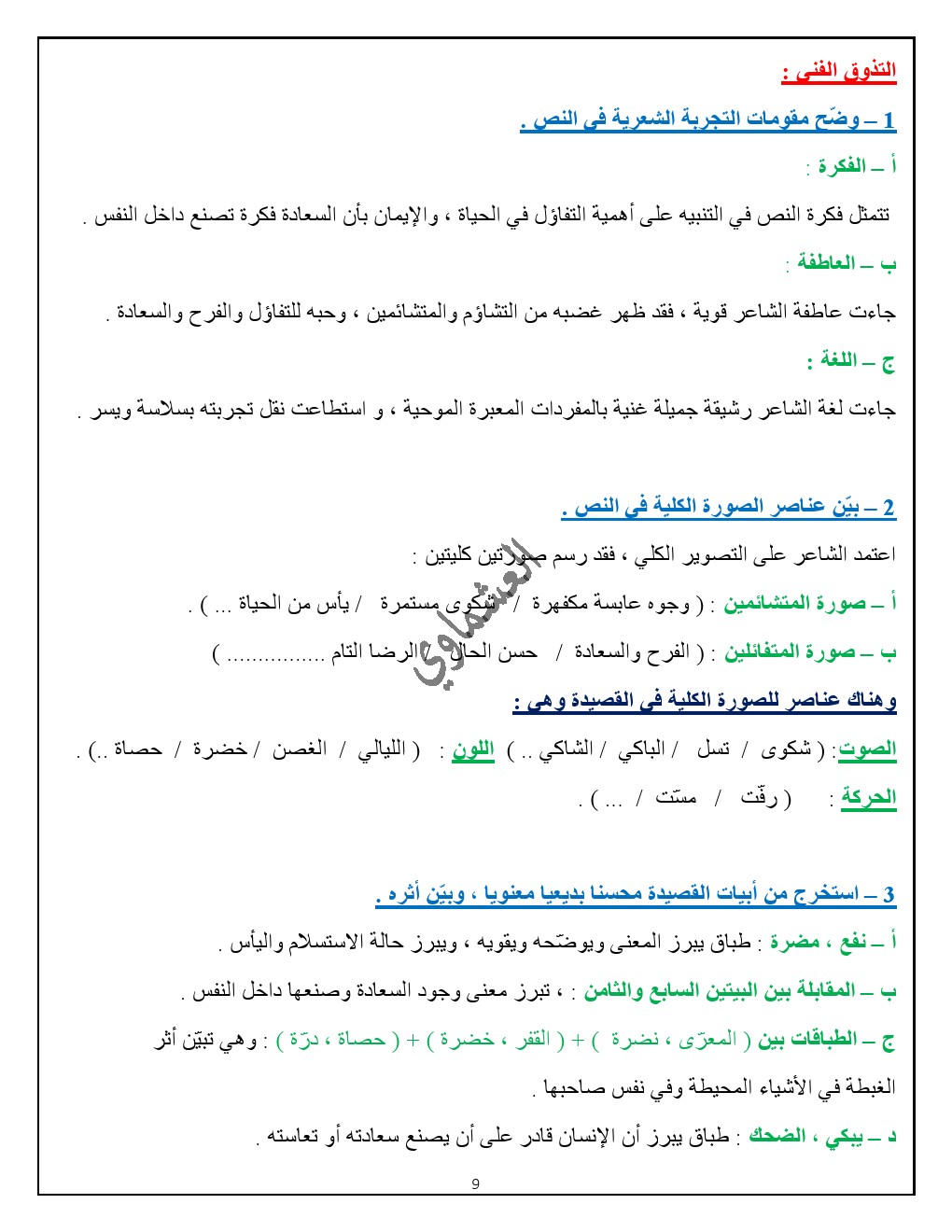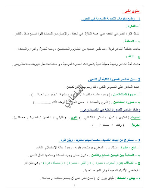 9. لغة عربية, الفصل الأول, 2025-2026, ملخص موضوعات الفهم والثروة والبلاغة والنحو